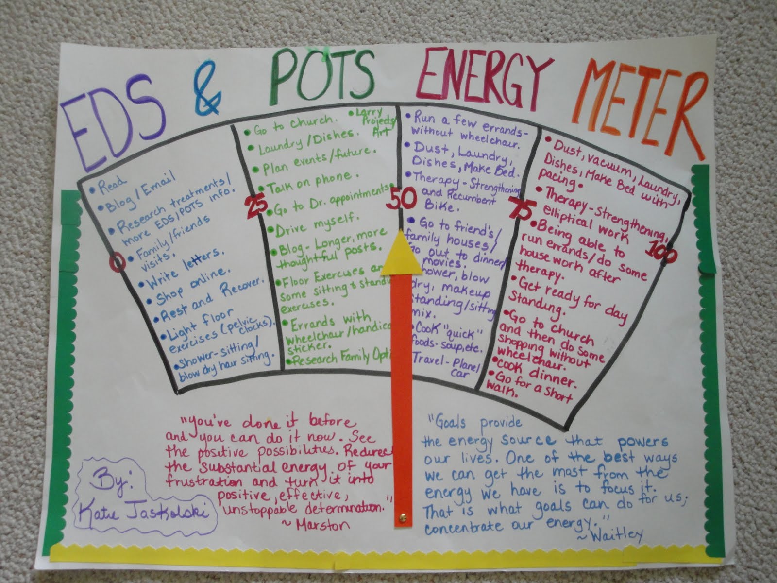 For the assignment, I decided I wanted to do an energy meter to represent my energy levels throughout a given day. As I showed it to him, I explained that the energy levels and fatigue I experience often fluctuate throughout the day. For example, today I started off at the 50-75% level. Then I went to therapy, and after an hour and a half, I was in the 0-25% range so I knew I had to rest and recover to combat the fatigue, so I could replenish some energy and function to do “the basics” in the afternoon and evening. Again, we talked a lot about goals, and that one of my main goals is to find strategies that help keep me in the 50-100% range the majority of the time. As I type, I am not sure if this is making sense to anyone reading this, but since I am living it, it makes a lot of sense to me.
