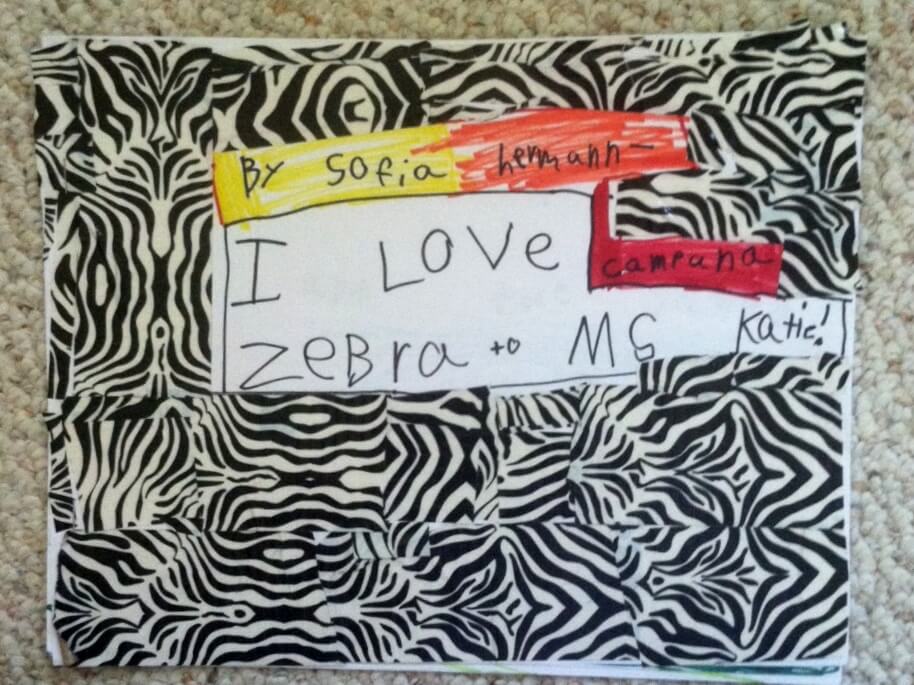 This work of art is a book with facts about zebras, beautiful illustrations, and a cover made with pieced together zebra duct tape.