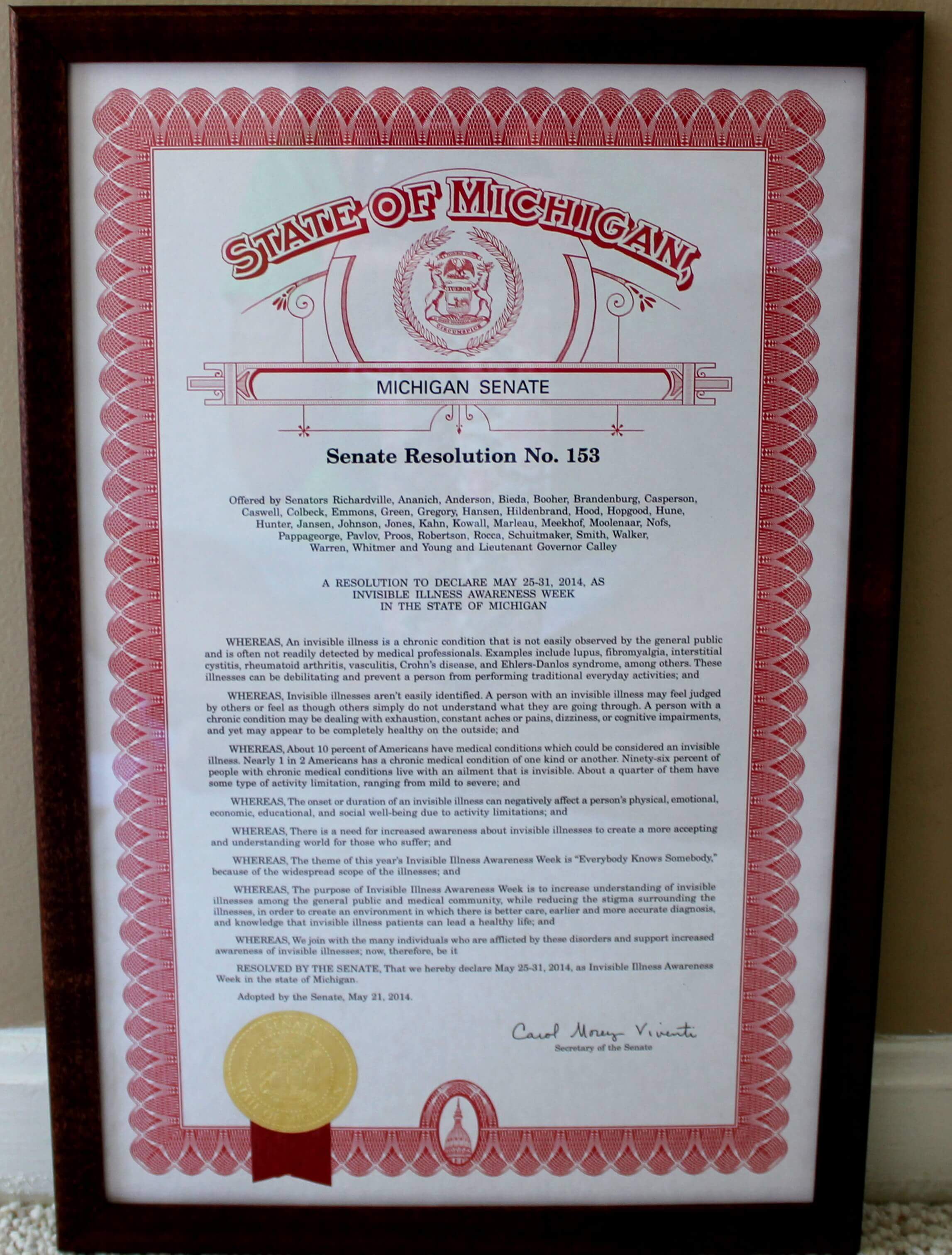 2. This came! The framed resolution from the Michigan Senate for Invisible Illness Awareness week! Next year, we are planning to go for a month! Isn’t it one of the most beautiful things you have ever seen?